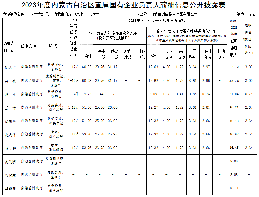 2023年度內(nèi)蒙古自治區(qū)直屬國有企業(yè)負(fù)責(zé)人薪酬信息公開披露表